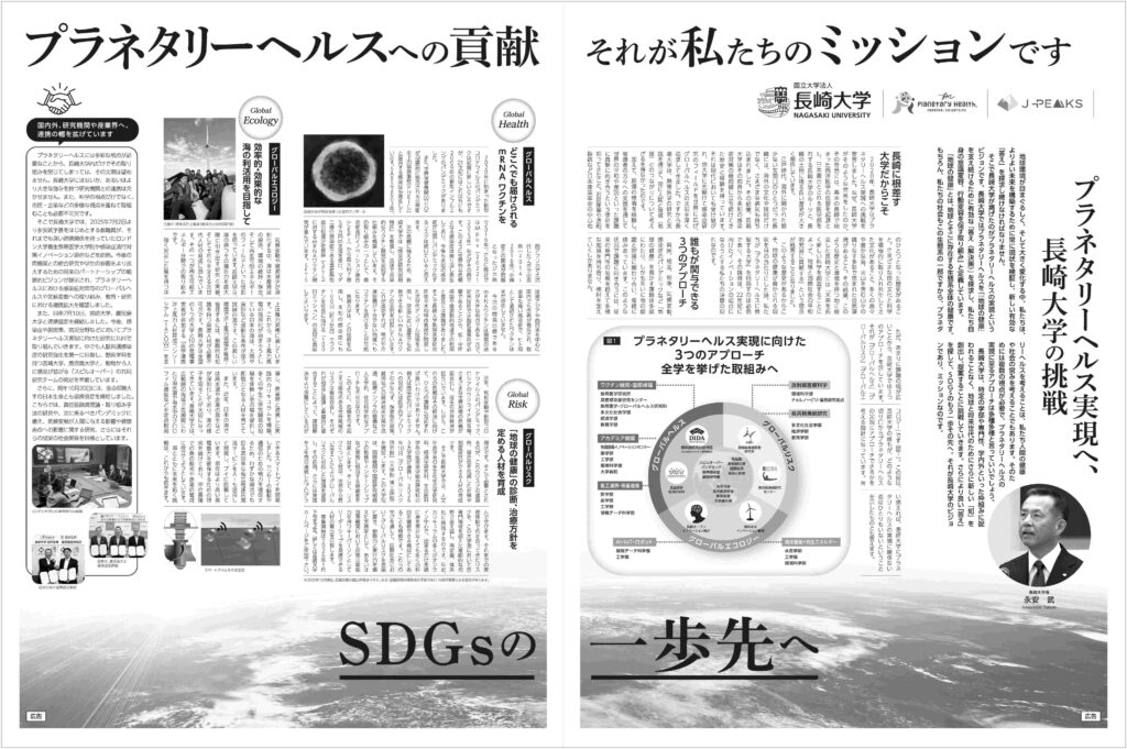 広告のテーマは、2025年に「地域中核・特色ある研究大学強化促進事業(J-PEAKS)」に採択され、本学がビジョンとして掲げる「プラネタリーヘルスの実現」です。しかし、一般の方々に向けてその説明を簡潔にすることは難しく、出来るだけ分かりやすい紙面を作ることを念頭に内容検討を進めました。その結果、本学がプラネタリーヘルスに取り組む歴史的背景や体制の紹介のほか、実際に取り組んでいる具体的な研究や教育を、グローバルヘルス、グローバルリスク、グローバルエコロジーの3つのアプローチごとに紹介することとしました。
